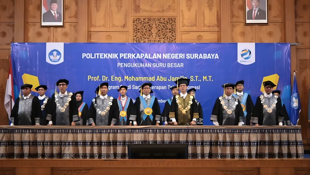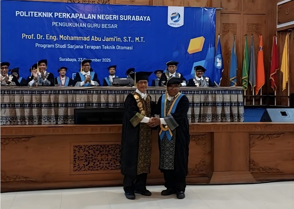 Surabaya (23/12) – Politeknik Perkapalan Negeri Surabaya (PPNS) kembali menorehkan capaian akademik membanggakan dengan dikukuhkannya Profesor Mohammad Abu Jamiin sebagai Guru Besar Bidang Teknik Elektro. Pengukuhan ini menjadi tonggak penting tidak hanya bagi Prof. Abu Jamiin secara pribadi, tetapi juga bagi penguatan mutu pendidikan vokasi dan riset terapan di lingkungan PPNS. Pengukuhan dilaksanakan secara khidmat di Grha Dewaruci PPNS pada Selasa (23/12) dan dihadiri oleh keluarga, rekan akademisi, dan guru besar.